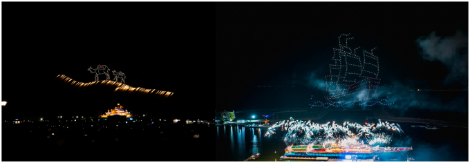 5月1日至5月4日,“夜上津門,焰遇航母”“五一”特別版大型沉浸式無人機焰火秀,在泰達航母重磅開燃。數萬發焰火在夜空中璀璨綻放,近千架無人機以天為幕,勾勒出“絲路駝鈴跨越千年”“海上絲路”“復興號列車”“MADE IN CHINA”等一幅幅彰顯中國力量的畫面,“絲路連山海,心合路自開”“歸”“山河終統一,日月共長天”字樣依次浮現,將家國豪情與團圓祈愿燃至沸點。“紫藤花海”綻放時如千萬朵發光的紫藤花旋落,鋪滿天際;七彩祥云煙花再度驚艷亮相,成為全場焦點。活動現場,海面、甲板、公園多場景聯動,高潮不斷,觀眾的歡呼聲、驚嘆聲此起彼伏,氣氛熱烈。節日期間,航母焰火活動獲得新華社、中國新聞網、天津電視臺等媒體報道近30次,抖音、小紅書等自媒體曝光超2000萬次。
