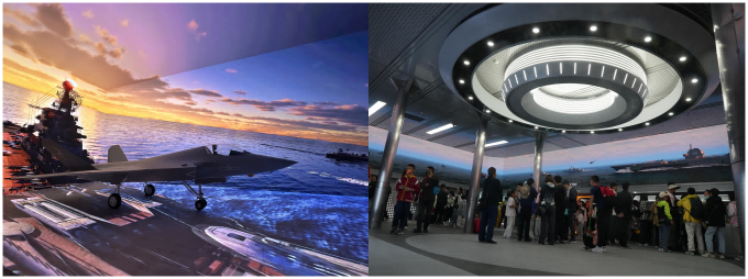 “五一”假期,全新涂裝的“基輔號”航母煥新亮相,在全新升級的五甲大廳,環繞式回型LED大屏動態展示航母編隊的恢弘氣勢;在魚雷序廳,通過數字化展陳為游客展示魚雷的運行原理與構造細節;在機庫大廳,通過裸眼3D數字技術真實還原艦載機起降情景;在其他開放區域,游客均可觸摸真實艦載武器,游客紛紛登艦,近距離感受這艘“海上巨人”的昔日榮光。此外,軍事愛好者們還紛紛登上“重慶號”驅逐艦,穿梭“長城號”潛艇狹長的艙室,揭秘深海無聲戰場的生存密碼。游客們還可登上退役護衛艇,全方位動態領略“航母編隊”的威武雄姿。在寓教于樂中,游客們感受著大國重器的雄渾力量,體驗了一場震撼心靈的軍事體驗之旅。