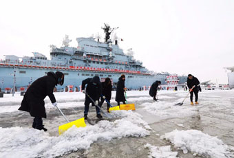 2月28日晚,新春第一場大雪如約而至,泰達航母主題公園銀裝素裹,分外美麗。但積雪結冰也給游客的出行帶來了不便以及安全隱患。為保障游客安全出行,3月1日一早,在公司領導班子帶領下,全體航母人“以雪為令”,迅速行動,第一時間將景區主干道上的積雪清掃干凈,為游客安全出行保駕護航。